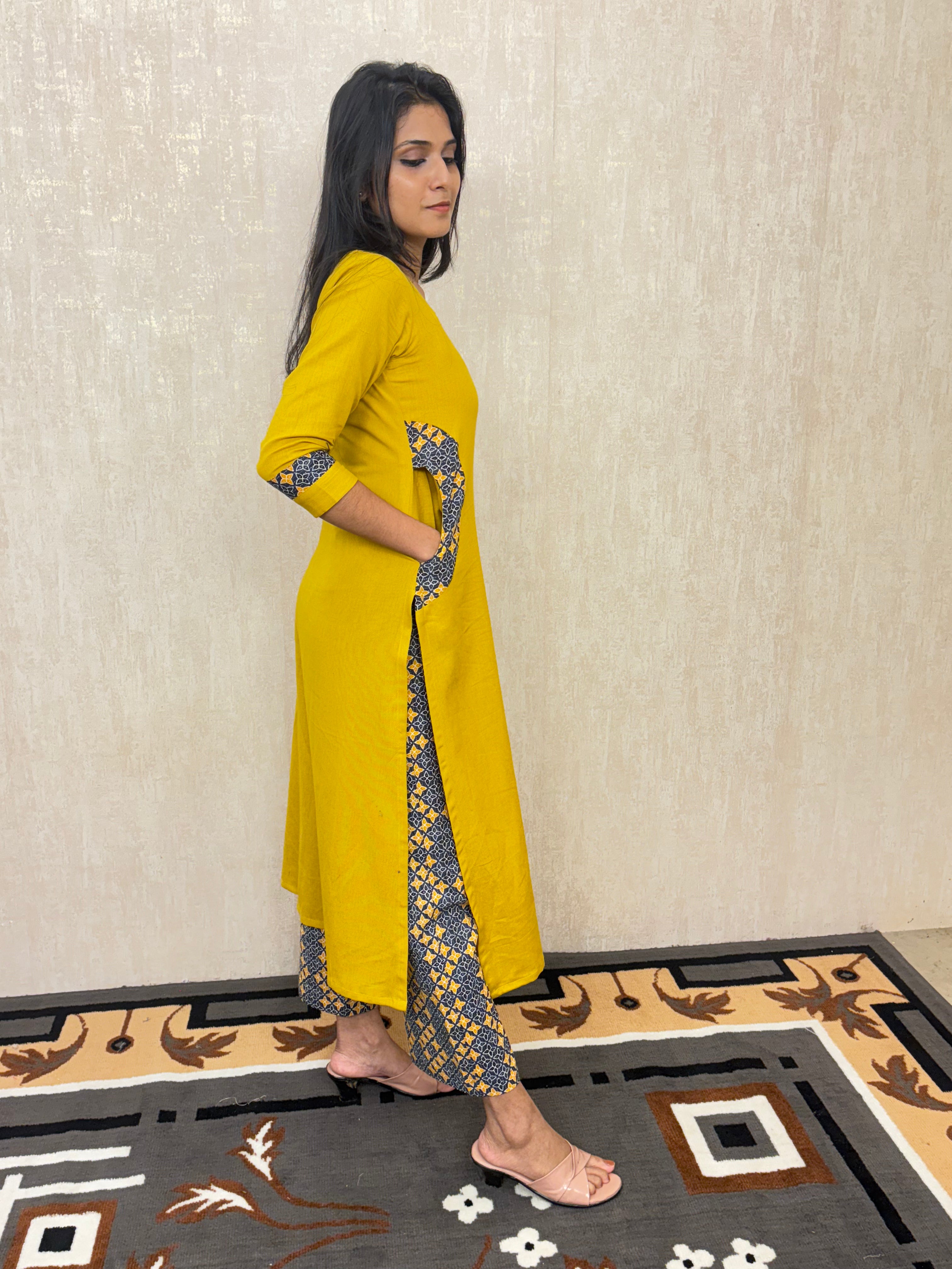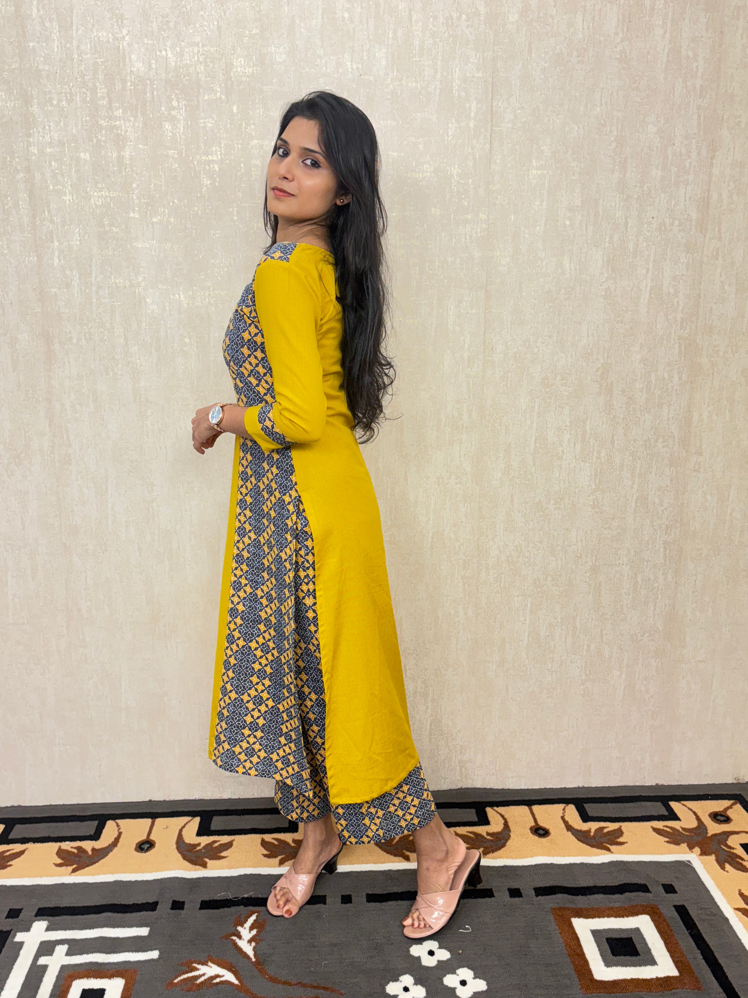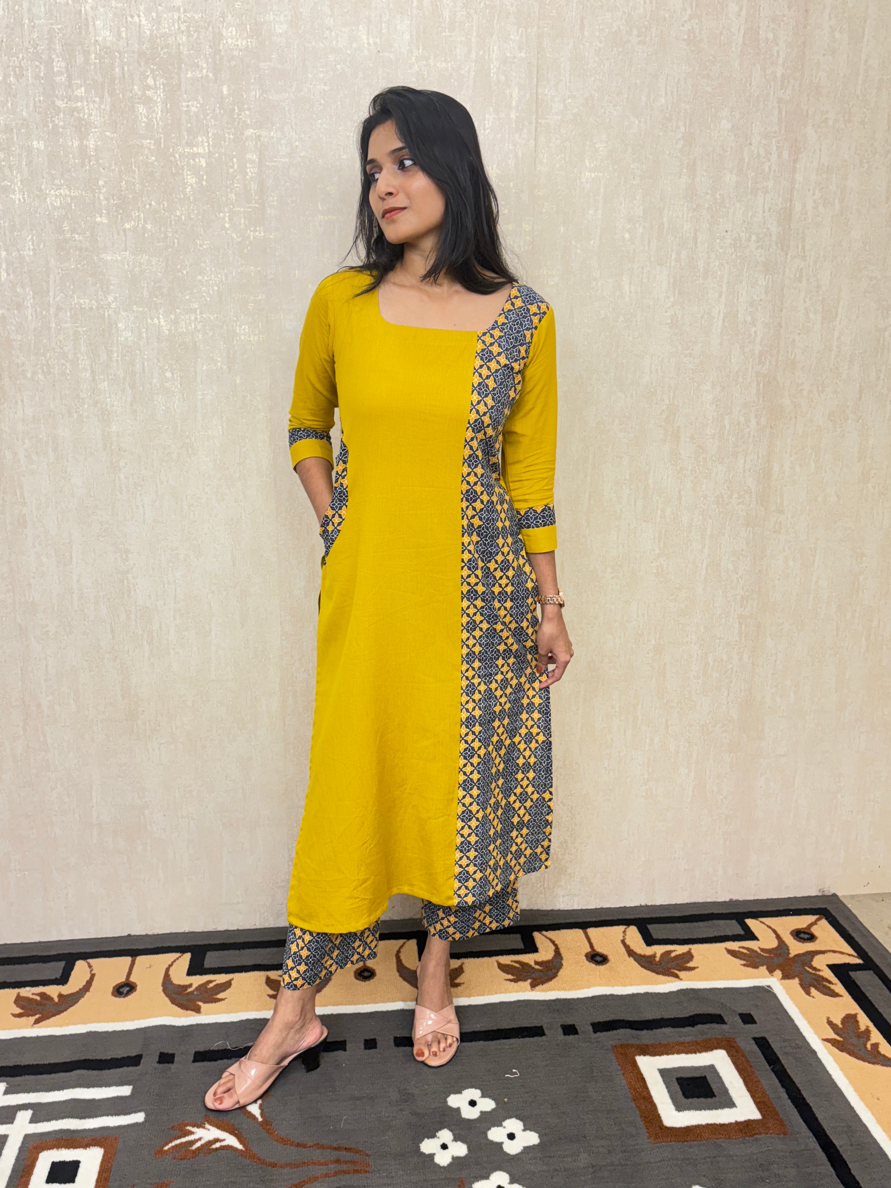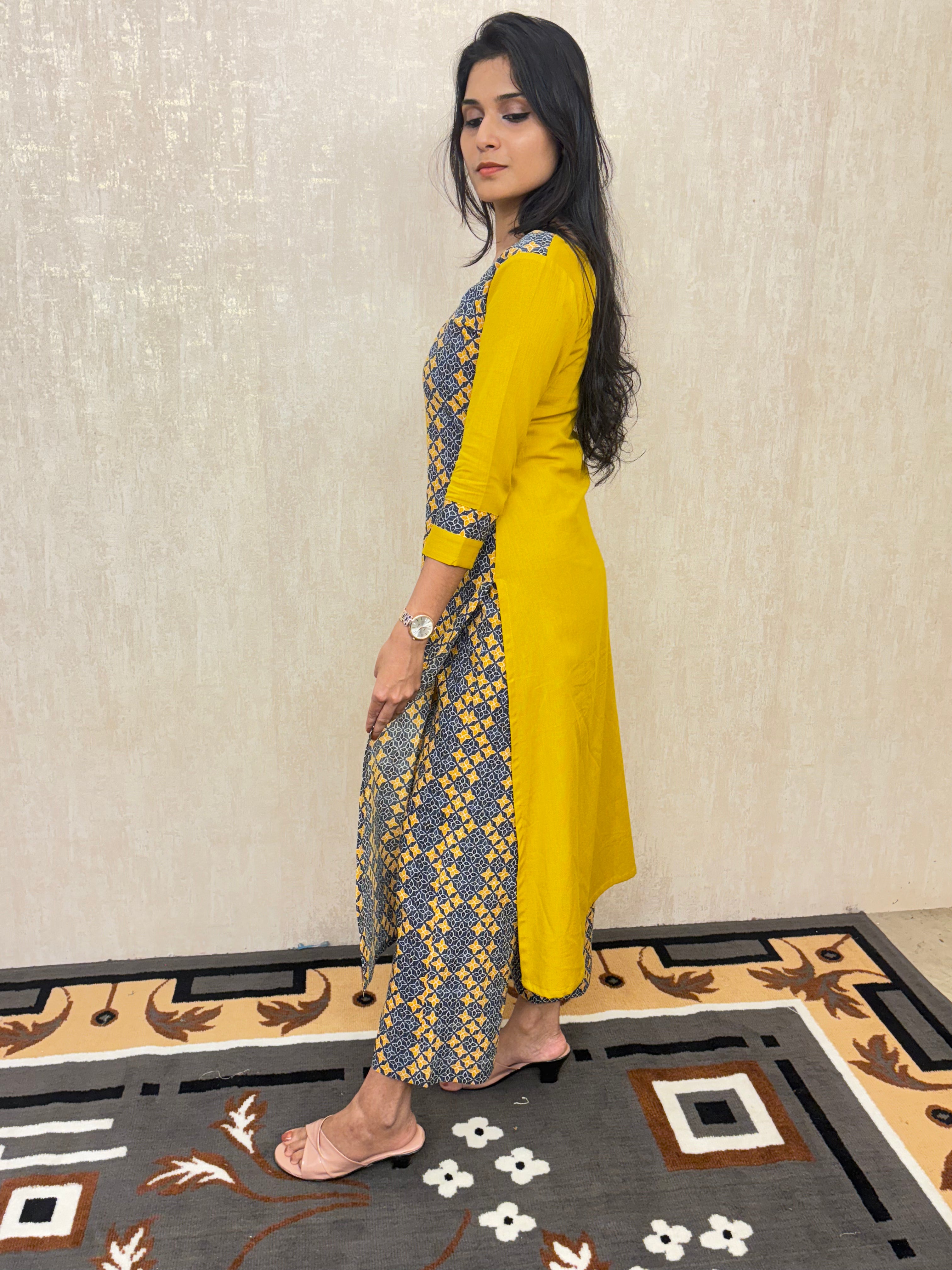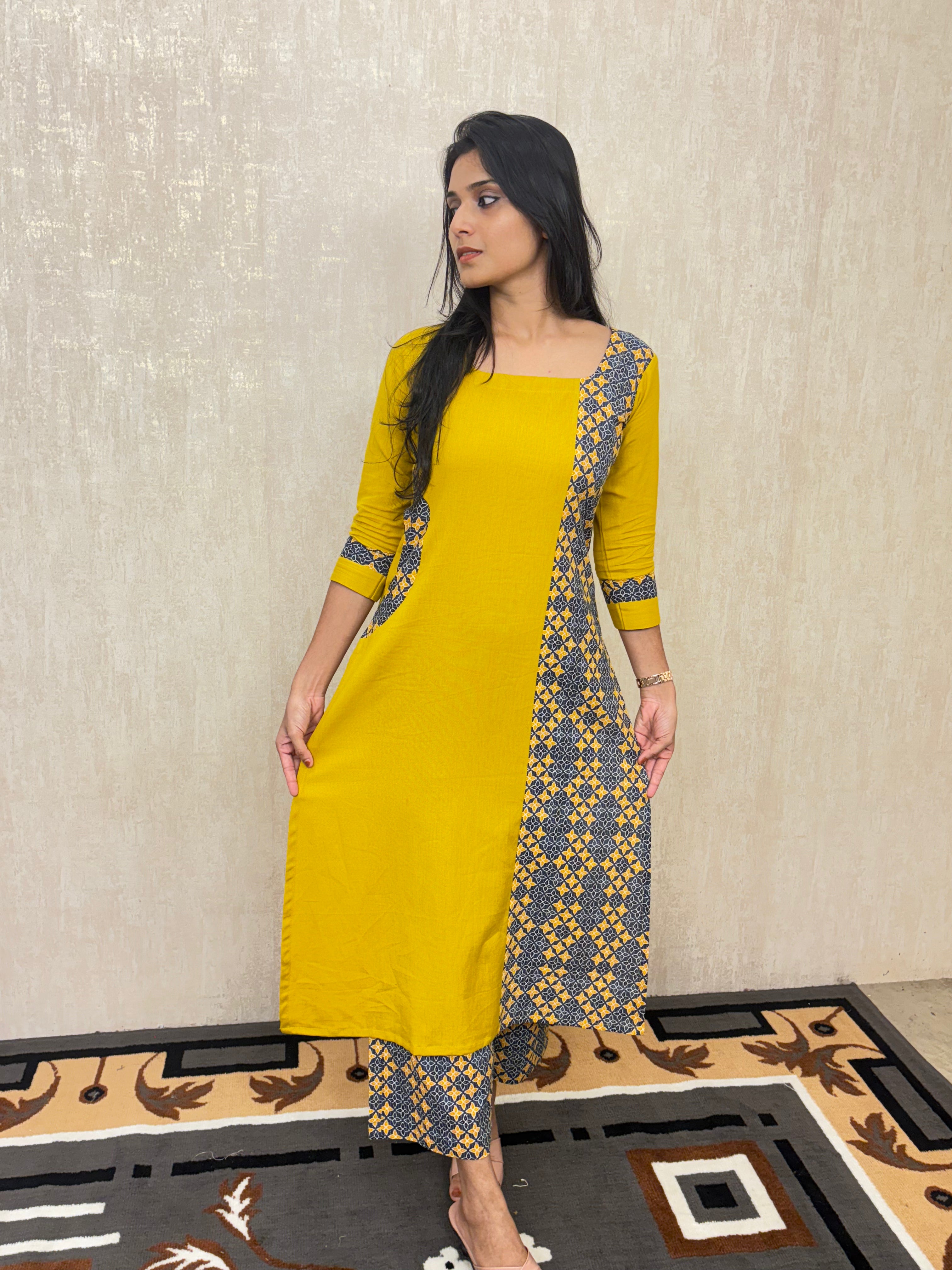 EC048 – Mustard Pure Cotton A-Line Kurti Set with Printed Detailing