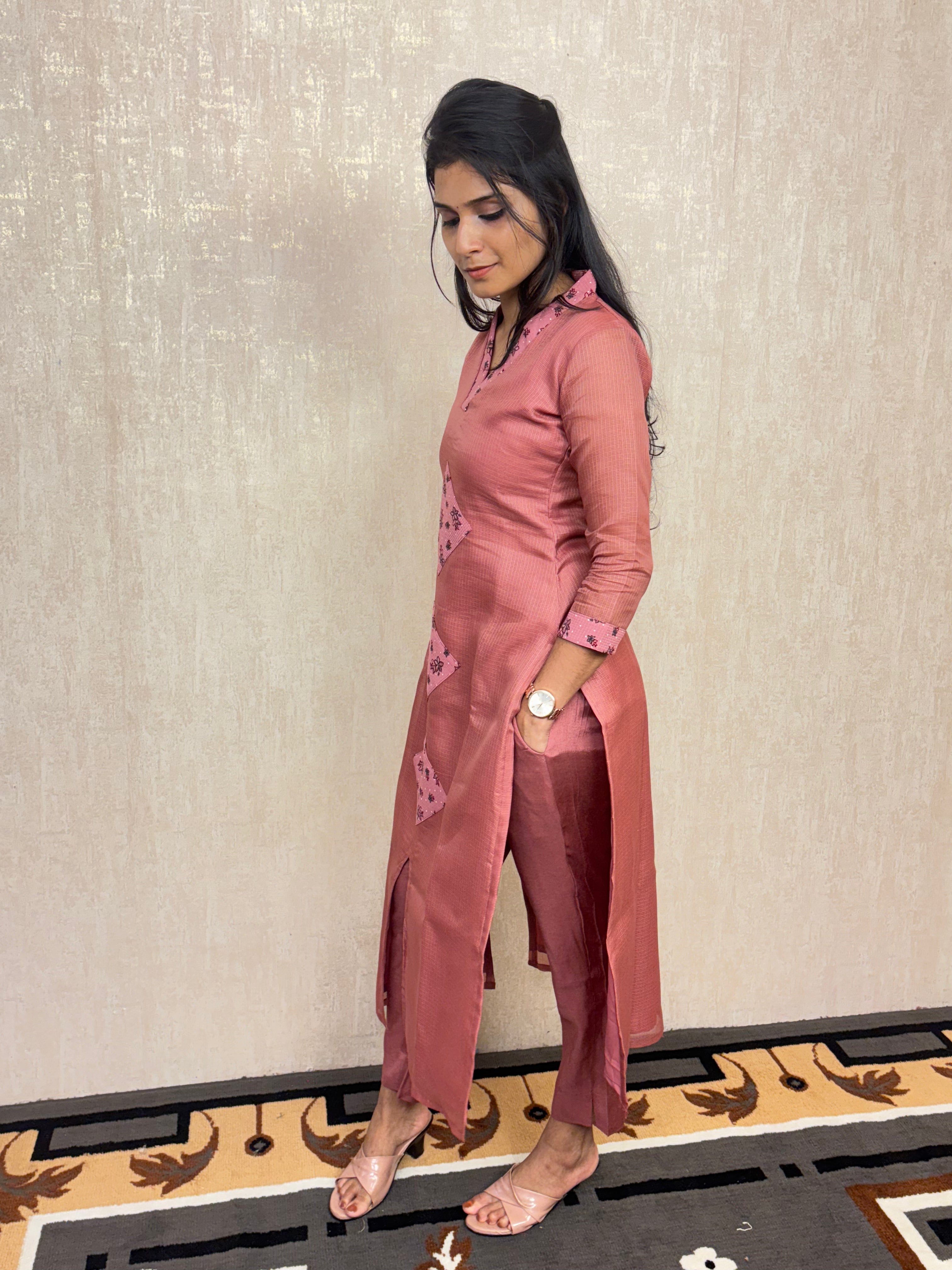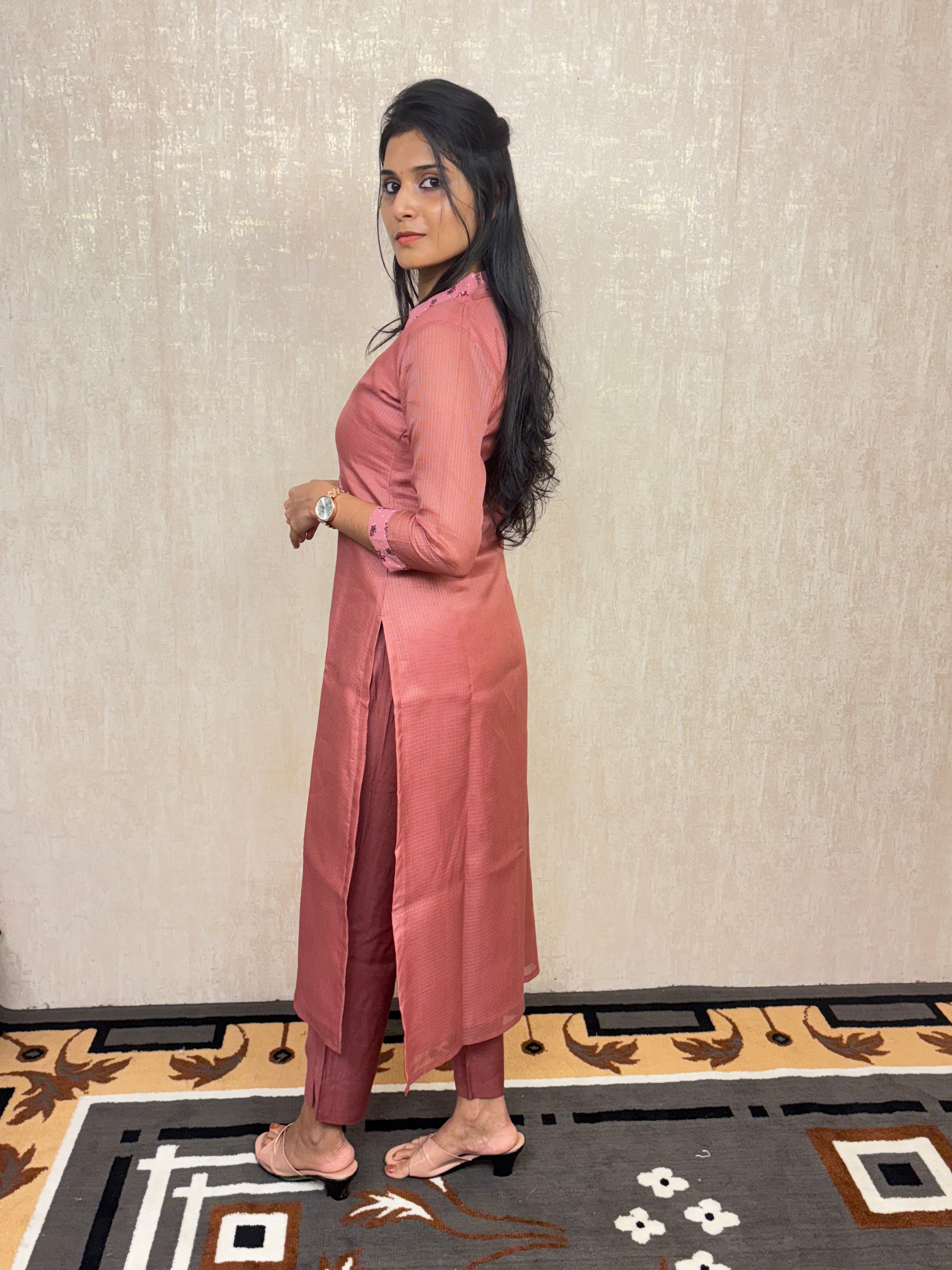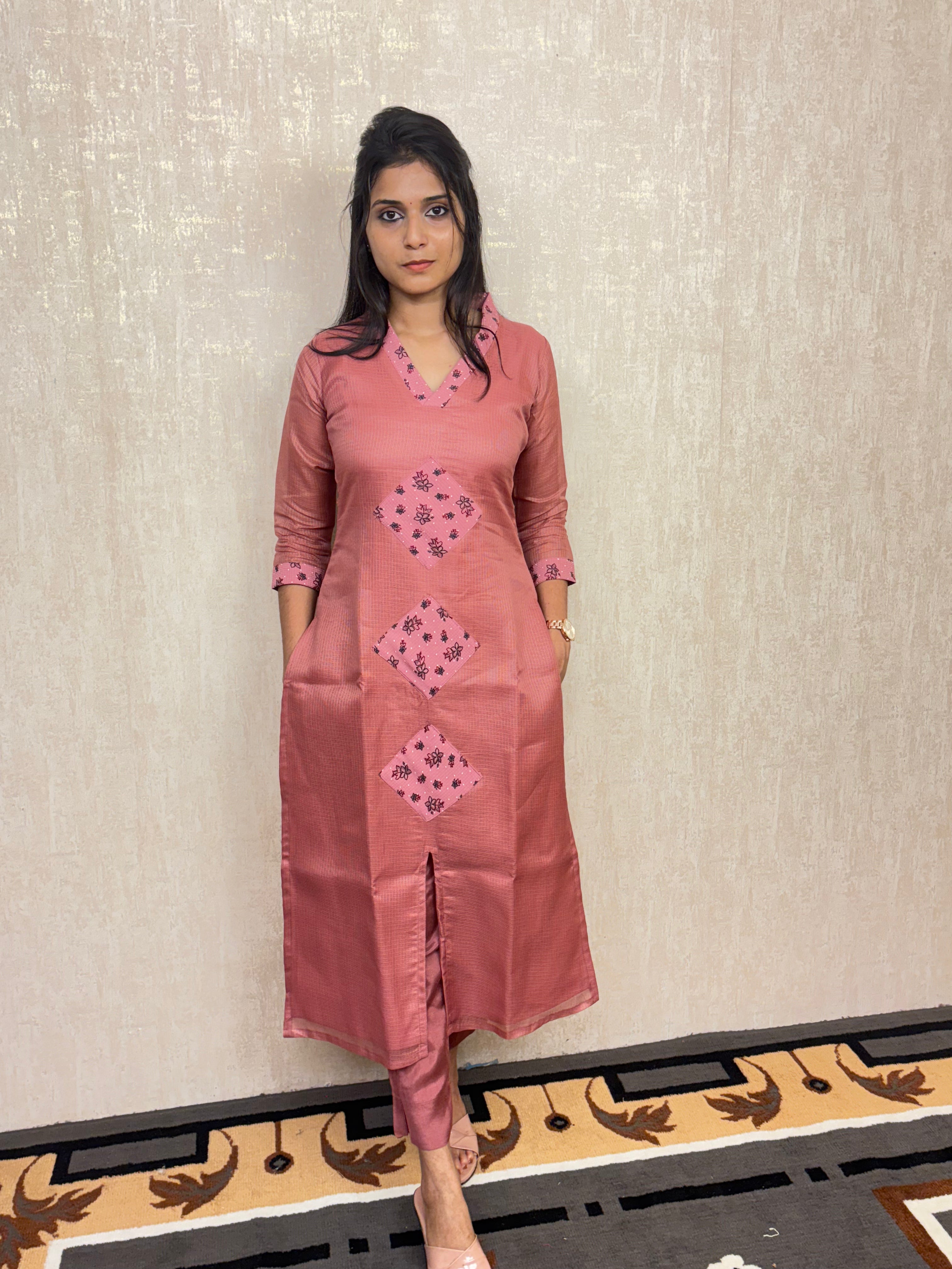 Onion Pink Net Cota Kurti Set with Modal Silk Pants EC049