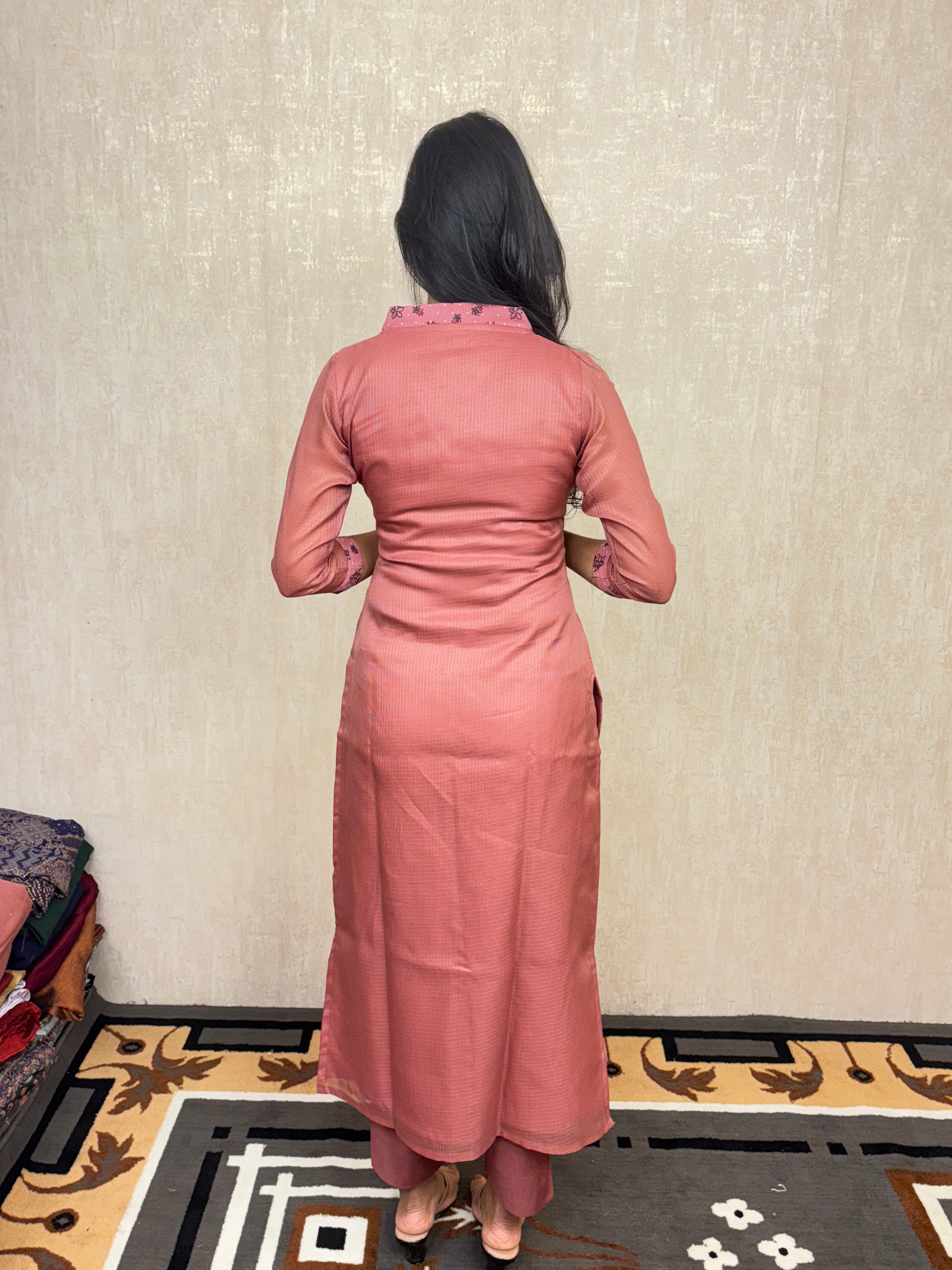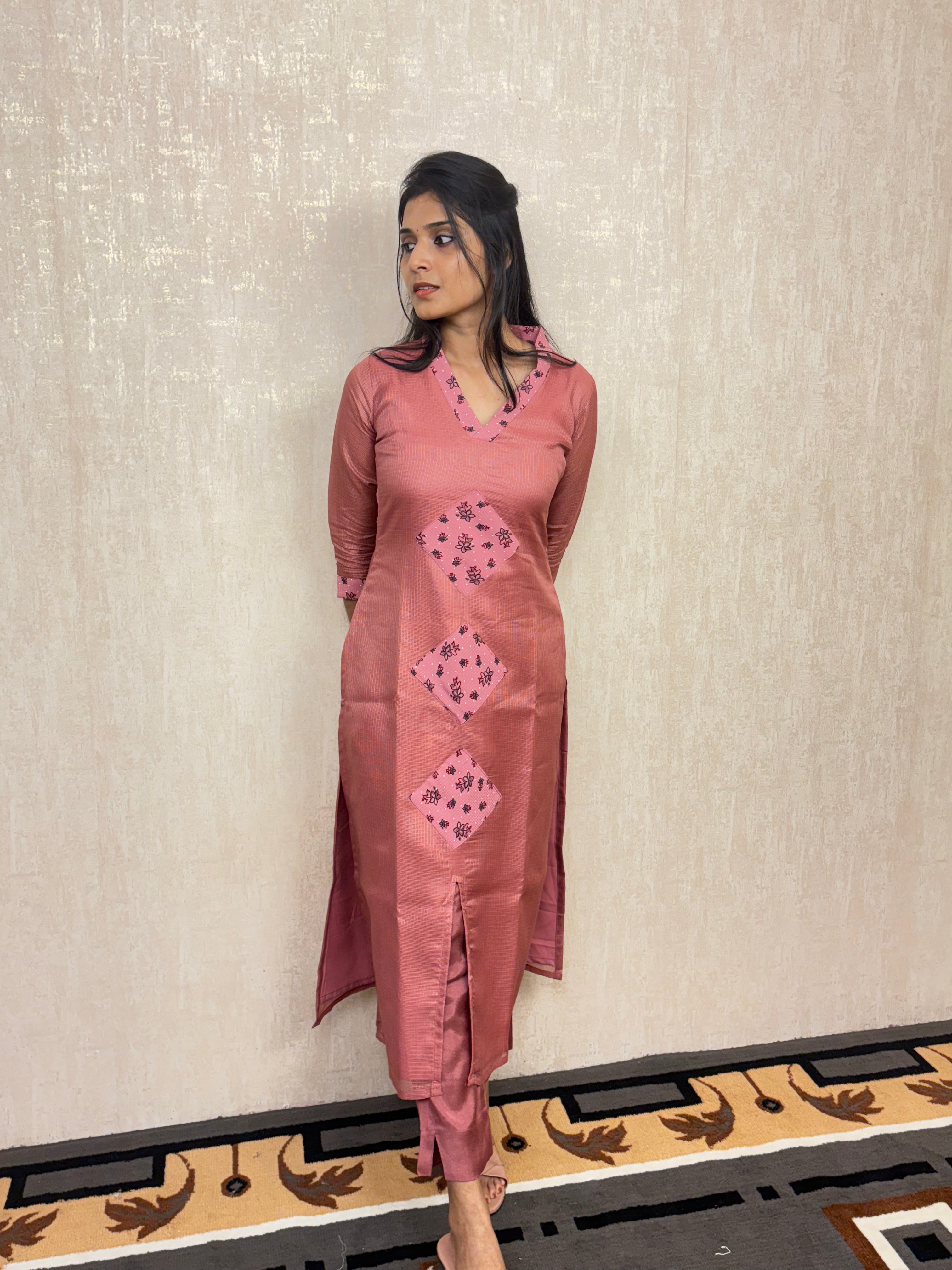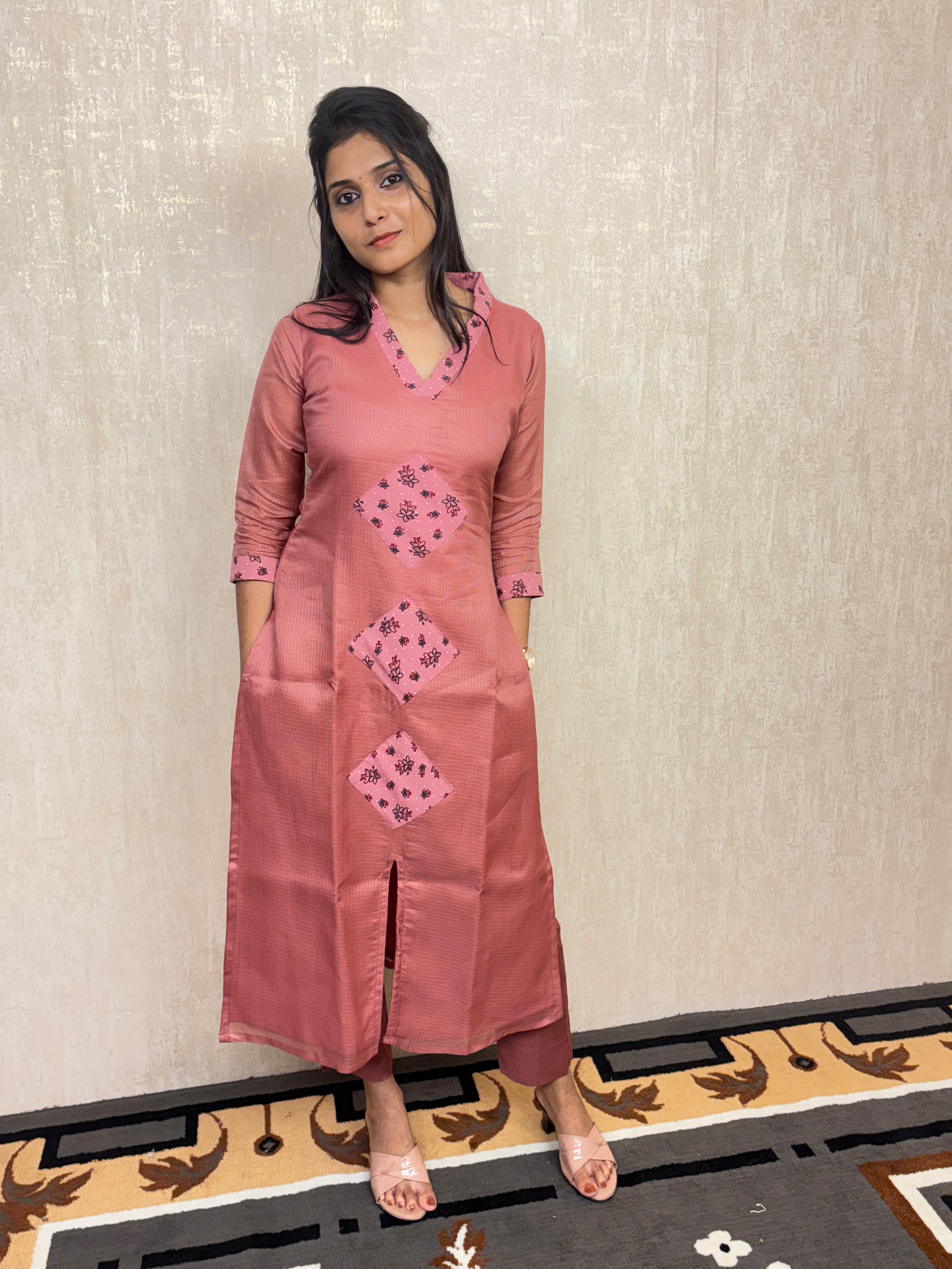 Onion Pink Net Cota Kurti Set with Modal Silk Pants EC049