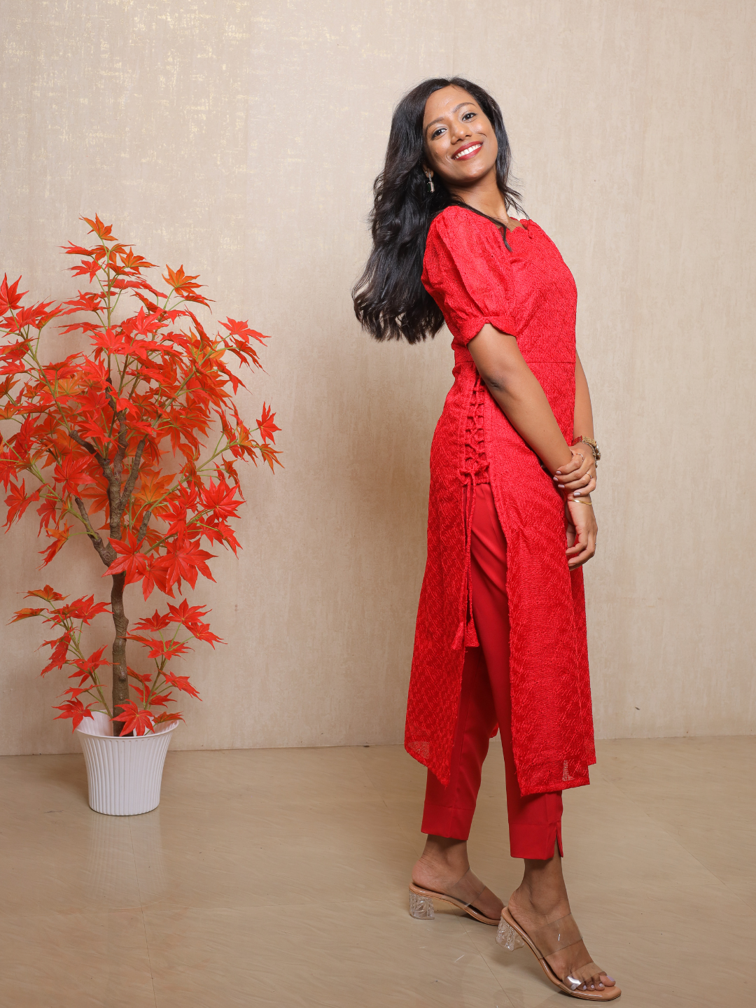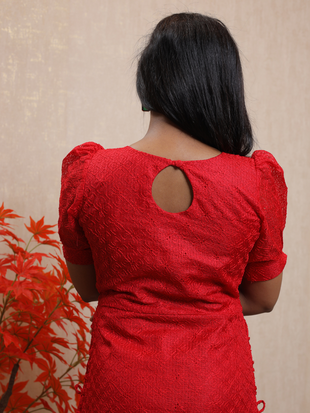 EC083 – Net Cotta Kurti Set with Scallop Neckline & Puff Sleeves
