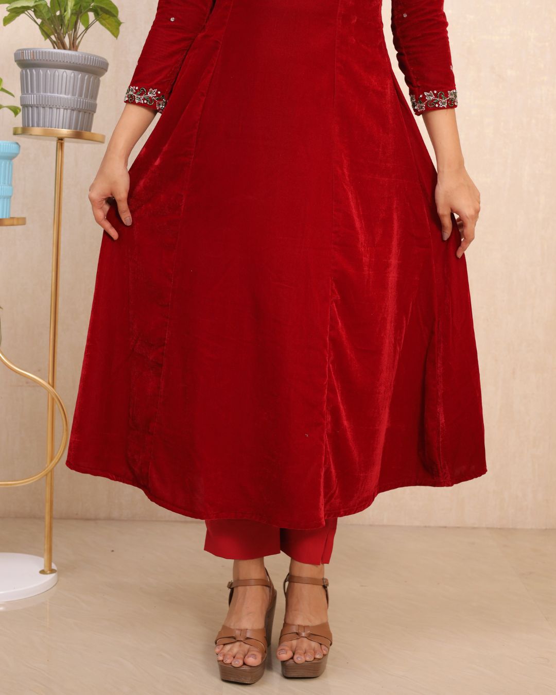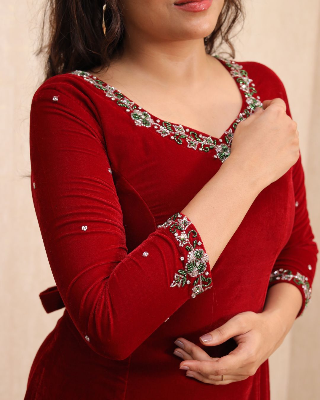 Soft Velvet Kurti Set – Handworked Neck & Sleeve Detailing | EC091