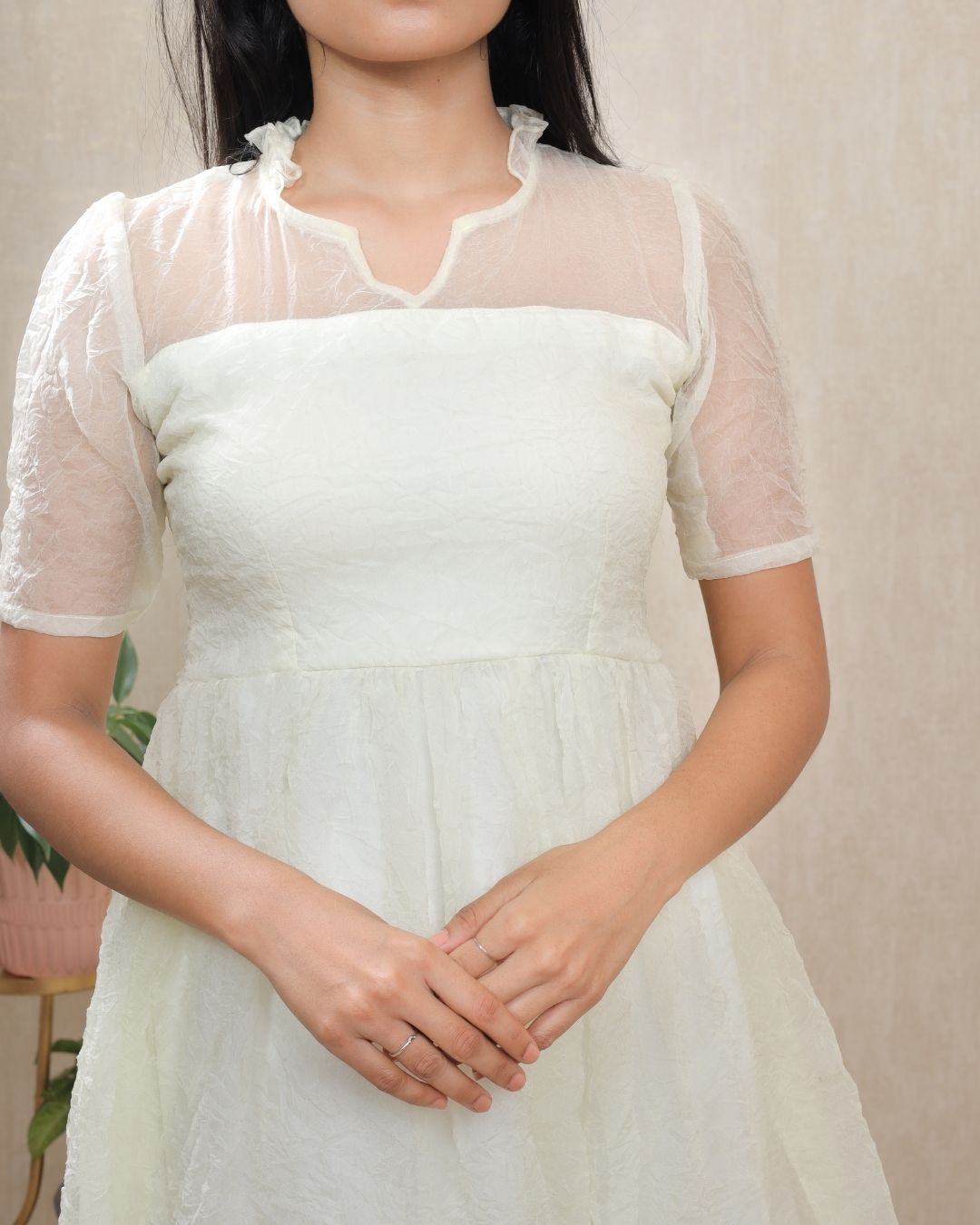 White Crush Silk Midi Dress with Sheer Yoke & Crepe Lining - EC094