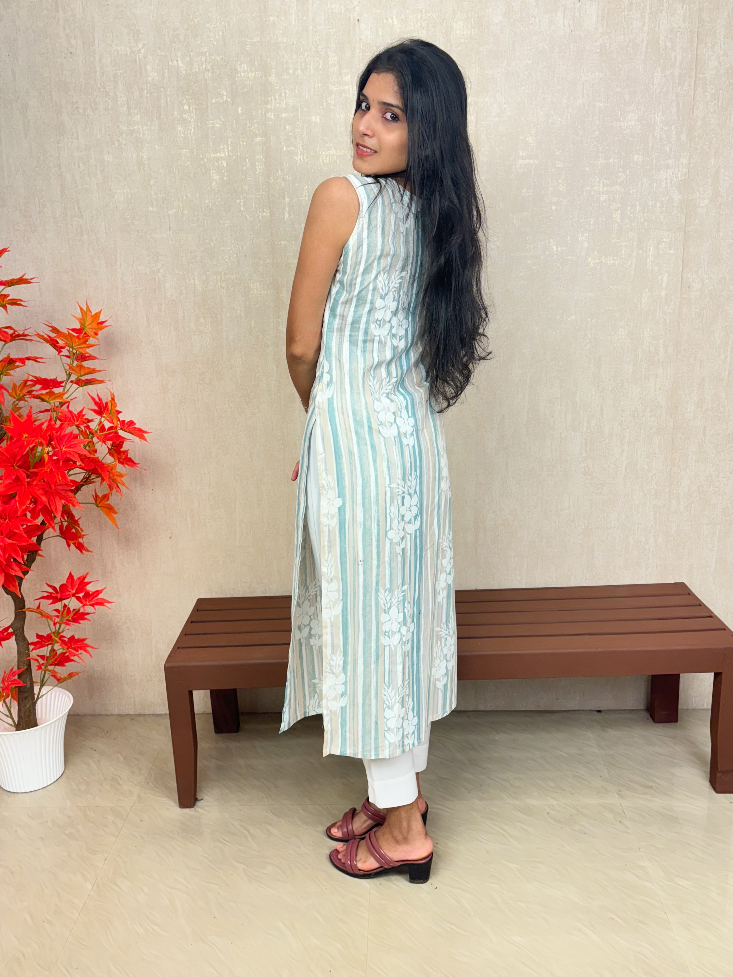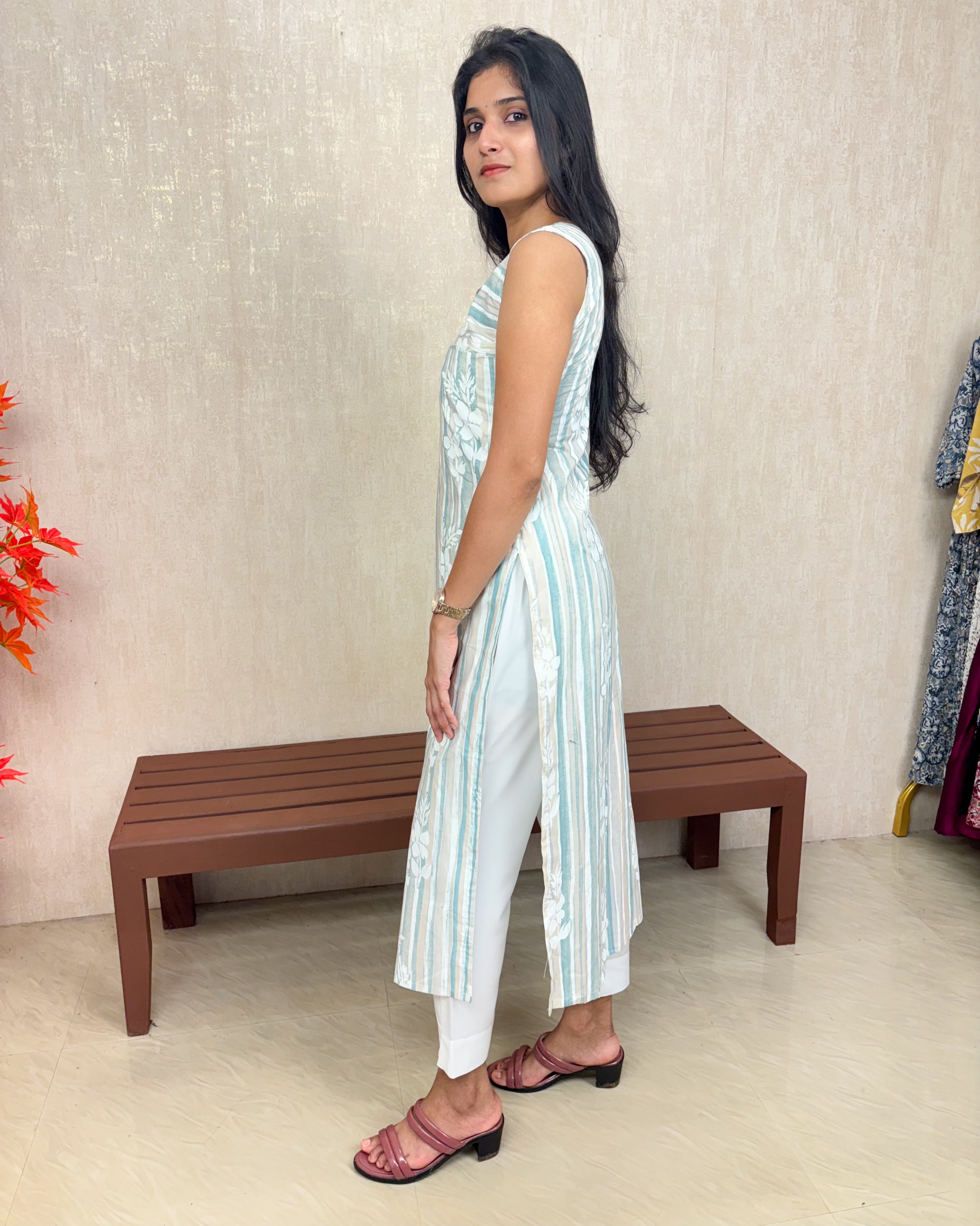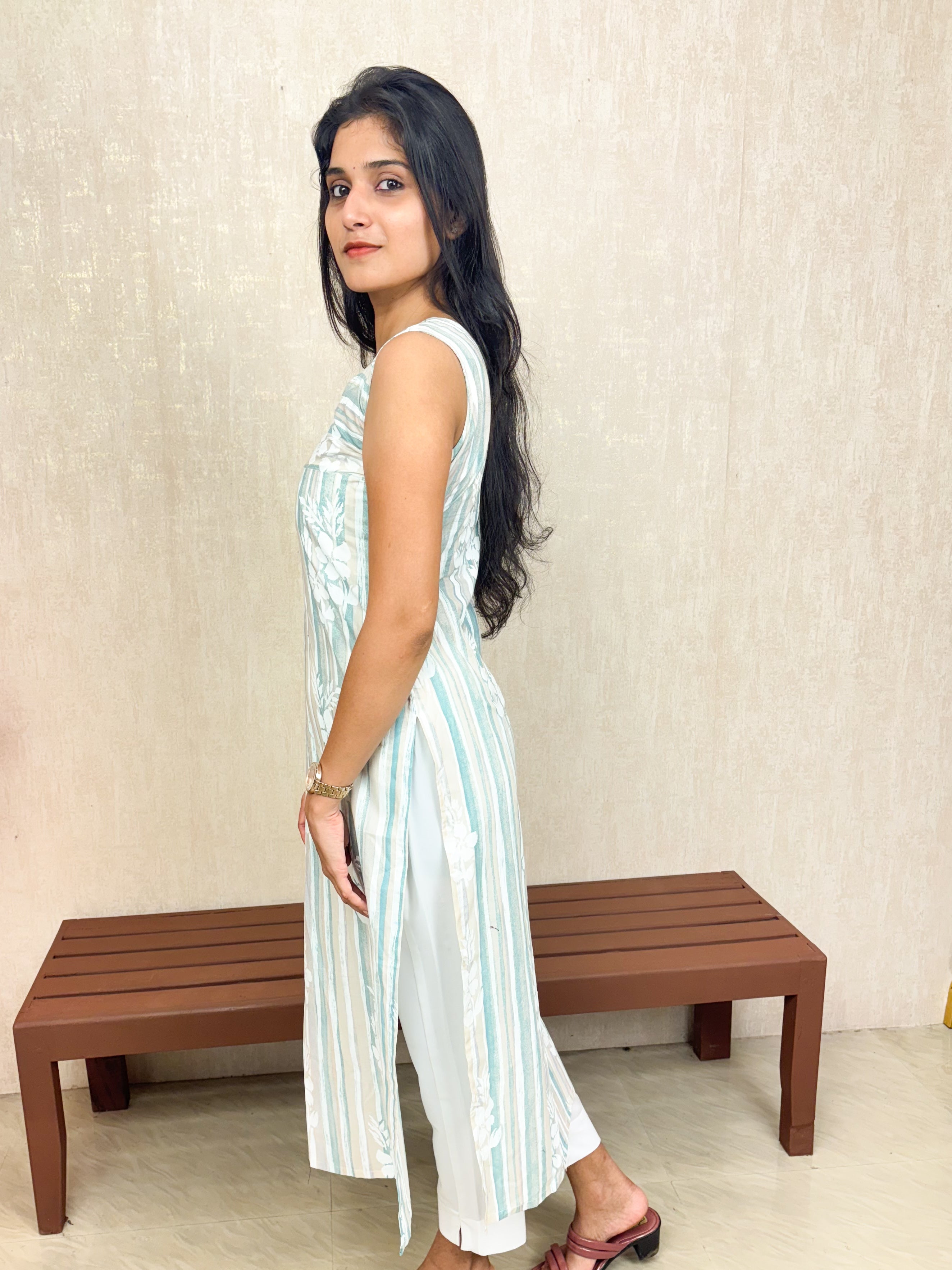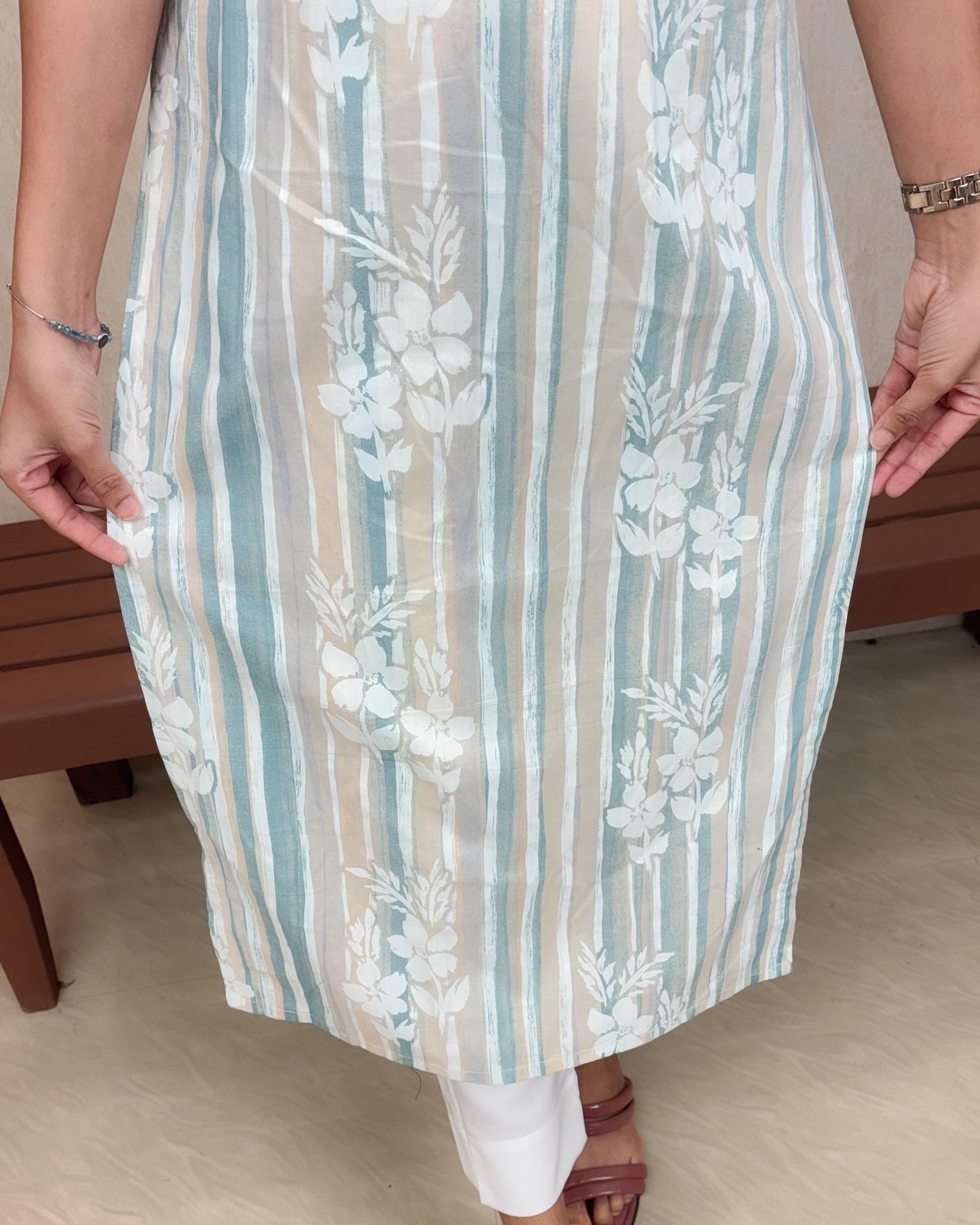 Elevate your everyday style with this 100% cotton kurti set from Ethnista Couture. Designed in soft pastel stripes with delicate floral detailing, this outfit blends comfort and elegance effortlessly.